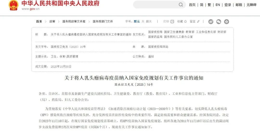 自2025年11月10日起,中国将面向全国,为2011年11月10日及以后出生、年满13周岁的女孩免费接种两剂双价HPV疫苗(间隔6个月)。这标志着中国在预防宫颈癌、促进妇女健康方面迈入了历史新阶段。