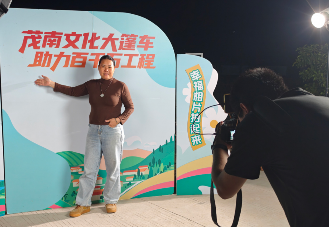 而在摄影点位前,来自幸福照相馆的摄影师忙着调试设备,不少村民带着小朋友与“茂南文化大篷车助力‘百千万工程’”背景板合影,在快门声中定格下全家欢聚的温馨瞬间。