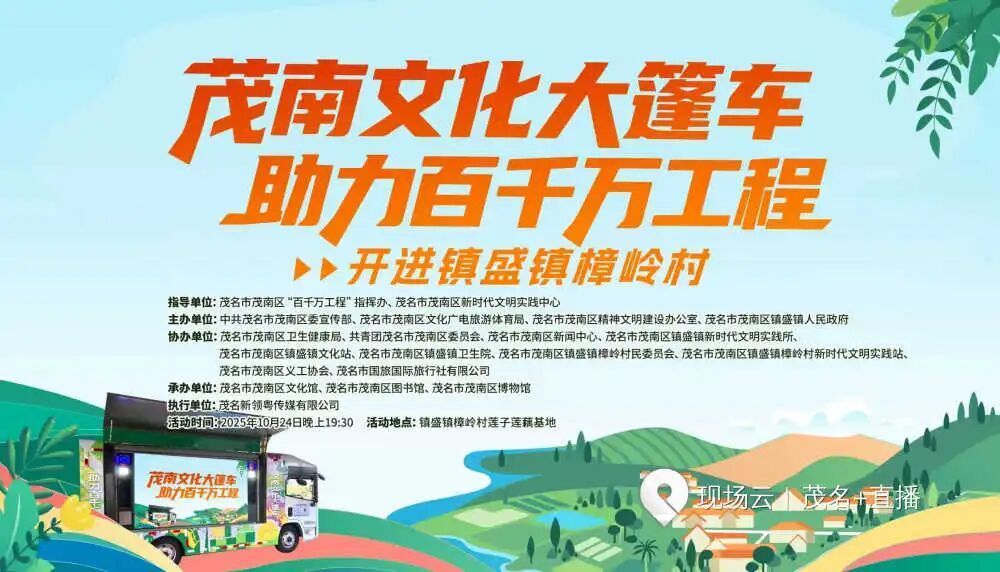 金秋十月,晚风送爽。10月24日,茂名市茂南区镇盛镇樟岭村莲子莲藕基地灯火璀璨、人声喧腾,“茂南文化大篷车”助力“百千万工程”主题活动在此热闹启幕。这辆搭载着高清显示屏的“流动文化舞台”,自今年8月起已陆续走进茂南多个镇村,此次更是带着文艺表演、志愿服务与惠民项目,为樟岭村村民带来一场浸润乡土情怀的文化盛宴,以实际行动赋能乡村振兴。
