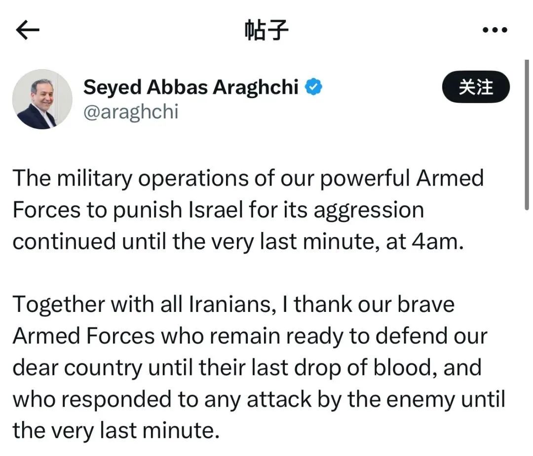 伊朗外长阿拉格齐24日在社交媒体上说,伊朗“强大的武装部队为惩罚以色列的侵略行径而采取军事行动一直持续到凌晨4时的最后一刻”,“我与全体伊朗人民一起感谢我们勇敢的武装部队”。